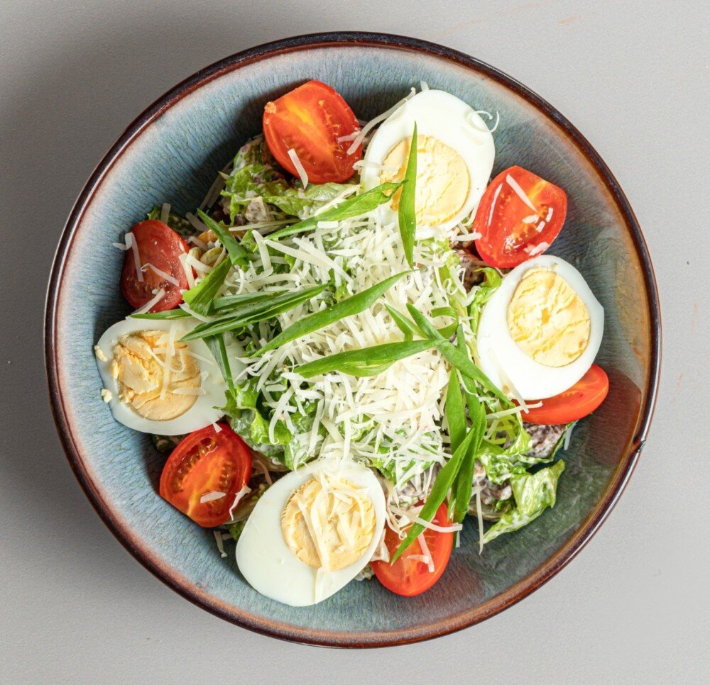 САЛАТ БАТЫР сытное сочетание обжаренной телятины, копченого говяжьего языка, хрустящих огурцов и перепелиных яиц.