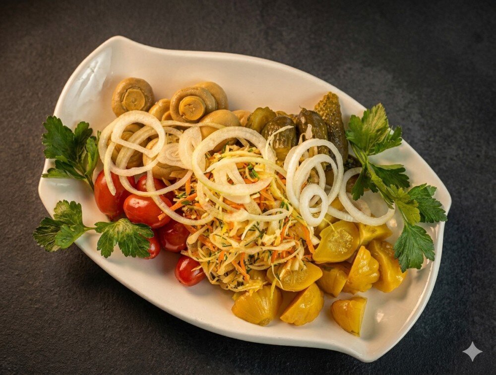 ДОМАШНИЙ РАЗНОСОЛ Аппетитное ассорти из квашеной капусты, соленых груздей, маринованных томатов черри, корнишонов и патиссонов.
