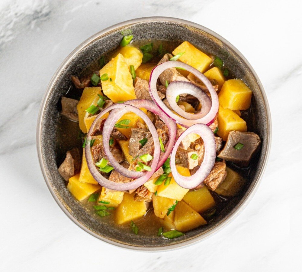 КУЫРДАК ИЗ ТЕЛЯТИНЫ сытное и ароматное блюдо из нежной телятины, говяжьего сердца и бараньего курдюка, обжаренных с картофелем.