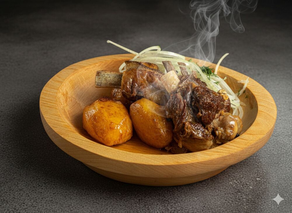 СЫРНЕ ИЗ БАРАНИНЫ блюдо из томленой на медленном огне бараньей лытки, подается с картофелем и луком. Медленное приготовление полностью раскрывает насыщенный вкус мяса