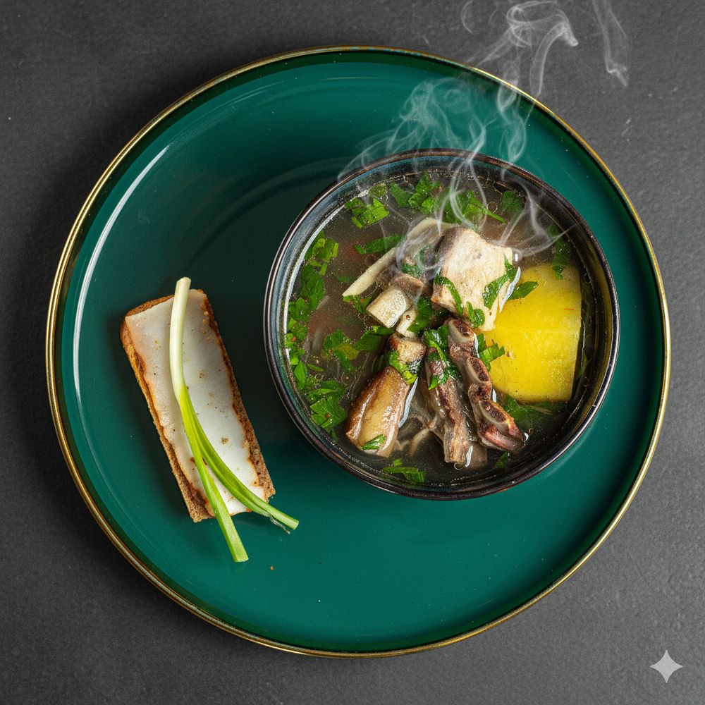 ШУРПА ИЗ БАРАНИНЫ наваристый бульон из сочной и ароматной баранины с овощами, подается с тостом с копченым курдюком.