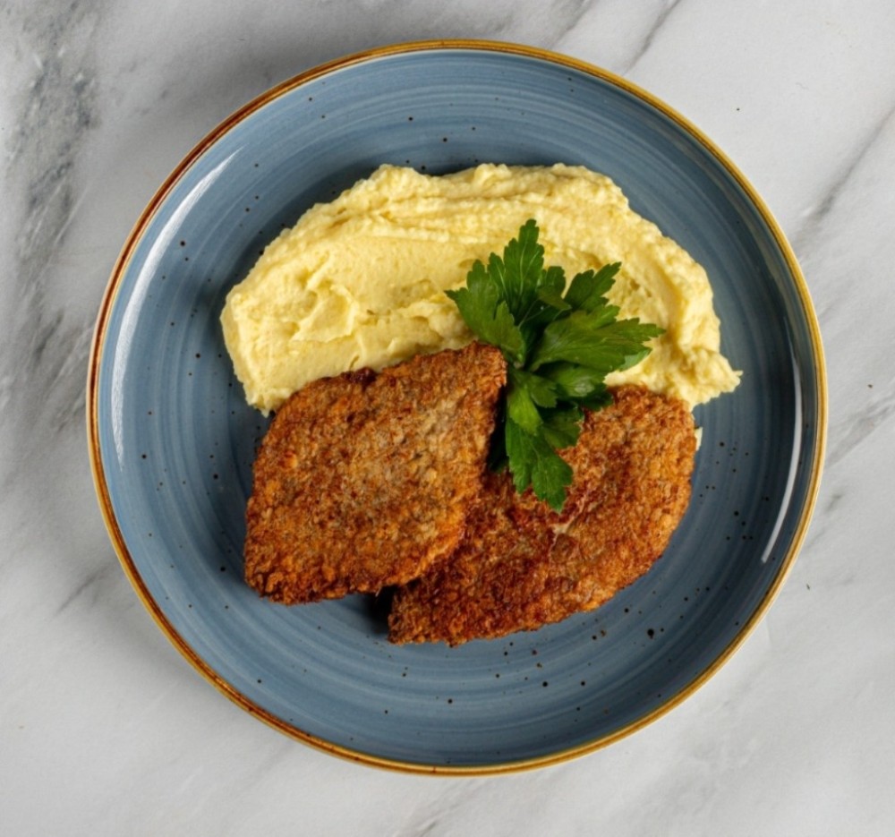 КУРИНЫЕ КОТЛЕТКИ нежные и сочные котлетки из куриного фарша, подаются с воздушным картофельным пюре и ароматным кетчупом.