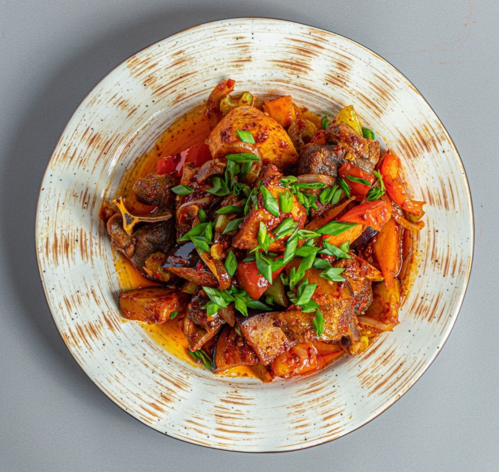БАРАНИНА ПО-ВОСТОЧНОМУ сочная и ароматная баранина на кости, обжаренная с болгарским перцем, баклажанами и луком с добавлением восточных специй.