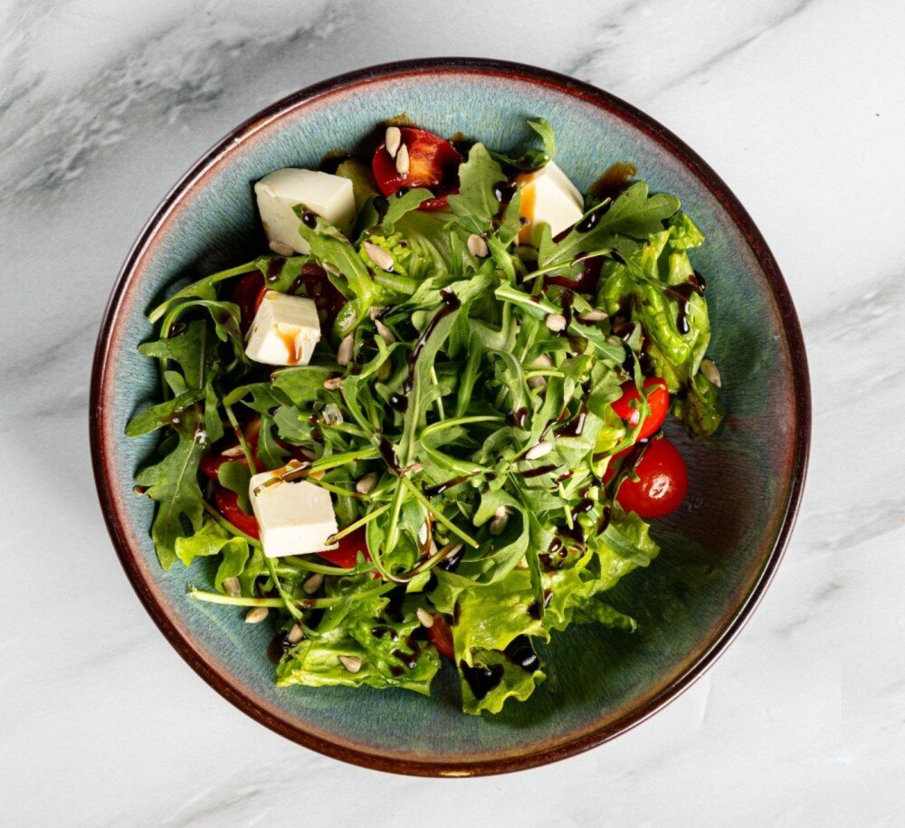 САЛАТ С РУККОЛОЙ И СЫРОМ ФЕТА легкое и освежающее сочетание пряной рукколы, микса салатов, сладких томатов черри и нежного сыра фета.