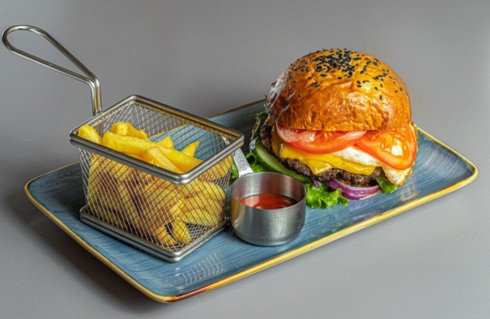 ГАМБУРГЕР сочная говяжья котлета в мягкой булочке с хрустящим салатом, спелыми томатами и нежным сырным соусом. Подается с хрустящими картофельными дольками и кетчупом.