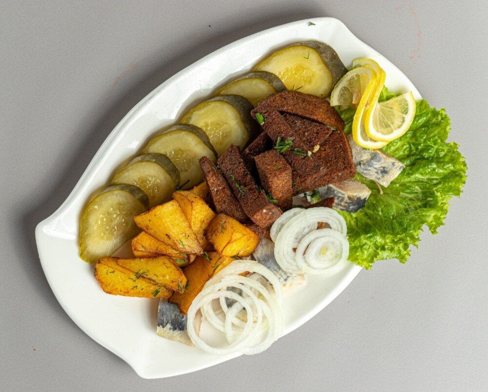 СЕЛЬДЬ ПО-ДОМАШНЕМУ Классическое сочетание нежного филе сельди, отварного картофеля и хрустящих корнишонов с пикантным красным луком и ароматными чесночными гренками.