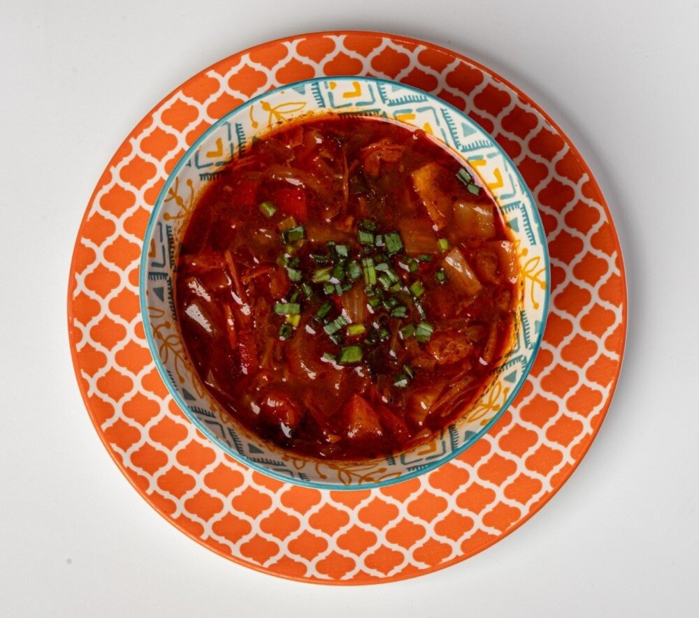 БОРЩ Традиционный насыщенный суп из телятины, картофеля, капусты, моркови и свеклы, подается со свежей зеленью и сметаной.
