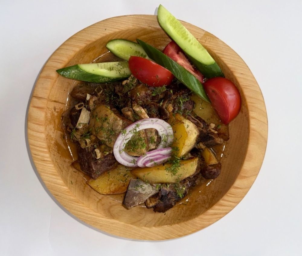 КАУЫРДАК ОТ ШЕФА сочное мясо баранины на кости, приготовленное с ароматными свежими овощами и зеленью.