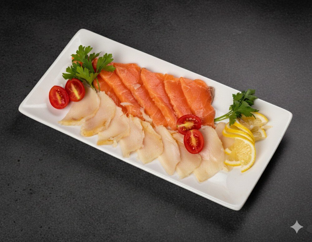 Изысканное сочетание нежного эсколара и ароматной копченной семги, дополненное свежими томатами черри, лимоном и петрушкой.