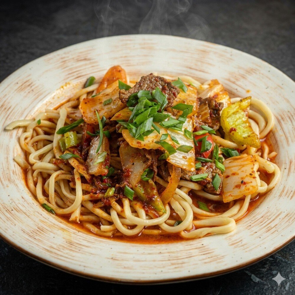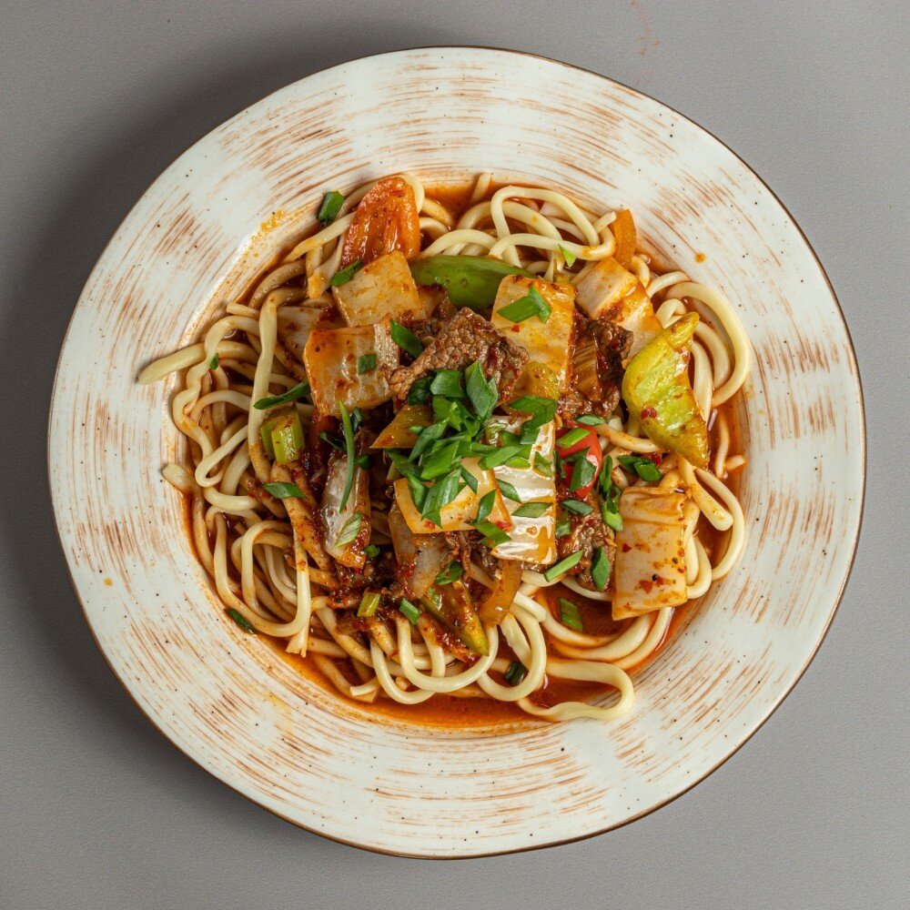 ГУЙРУ ЛАГМАН ароматное блюдо с нежной говядиной и сочными овощами в насыщенном пряном соусе и упругой домашней лапшой.