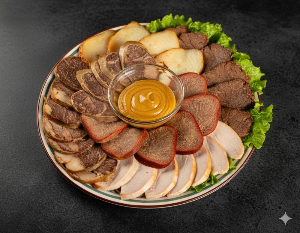 МЯСНАЯ НАРЕЗКА Традиционное ассорти из отварного шужыка, нежного жая, копченого курдюка и куриной грудки, подается на свежем листе салата.