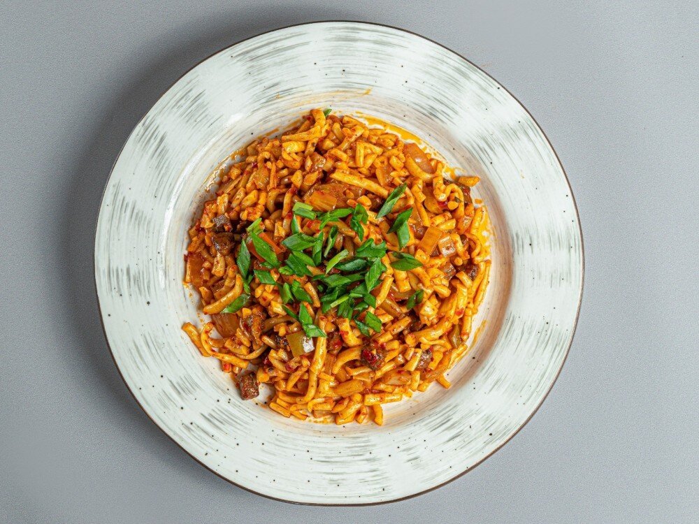 ЦОМЯН острое блюдо из домашней лапши, жаренной с сочной говядиной, овощами и острым перцем.