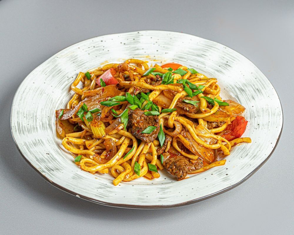 КАУРМА ЛАГМАН упругая домашняя лапша, обжаренная с овощами на томатном или соевом соусе по Вашему выбору.