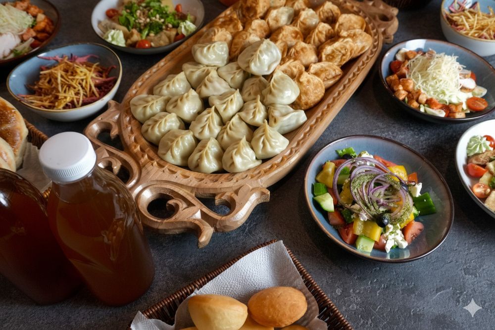 Вы сохраняете 15 271 тг. Большой праздничный сет: манты жареные и паровые по 4 порции, четыре салата — баклажаны, цезарь, французский и греческий, баурсаки, 6 лепёшек и 4 компота. Максимум разнообразия и щедрости в одном выгодном наборе.